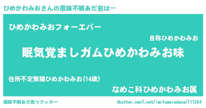 | 男性向けラノベタイトル風あだ名 | 『おまえをオタクにしてやるから、俺をひめかわみおにしてくれ! 』 |