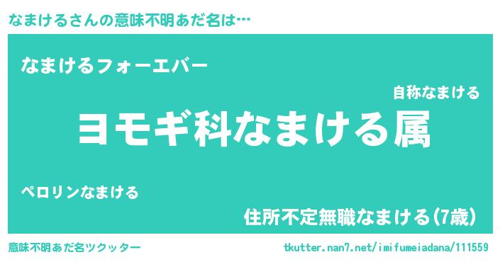 | 男性向けラノベタイトル風あだ名 | 『なまける~年齢イコール彼女いない歴の魔法使い~』 |