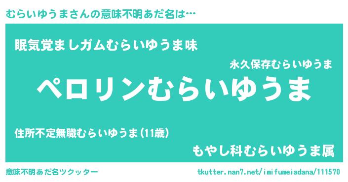| 胡散臭い通販商品みたいなあだ名 | 『億万長者になれるブレスレット…その名も「むらいゆうま」』 |