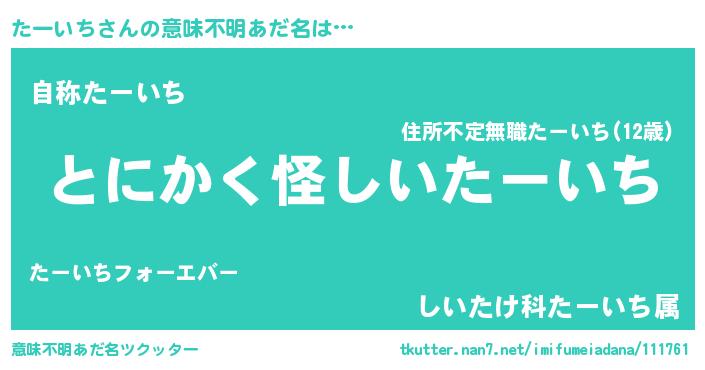 | 女子向けラノベタイトル風あだ名 | 『たーいちの卵を拾いまして』 |