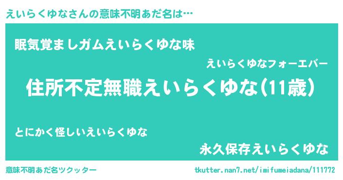 | 女子向けラノベタイトル風あだ名 | 『えいらくゆなが死なない童話 林檎のえいらくゆなの診療簿』 |