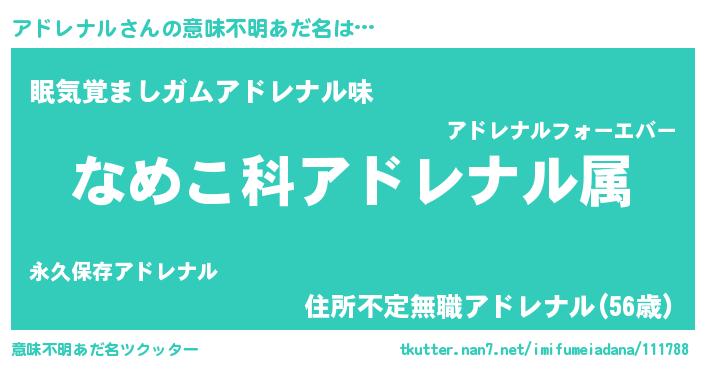 | ヘコむあだ名 | 『なまこ酢』『アドレナル(震え声)』 |