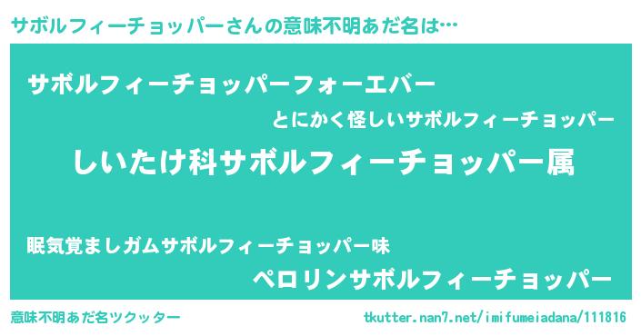 | 男性向けラノベタイトル風あだ名 | 『はたらくサボルフィーチョッパーさま!』 |