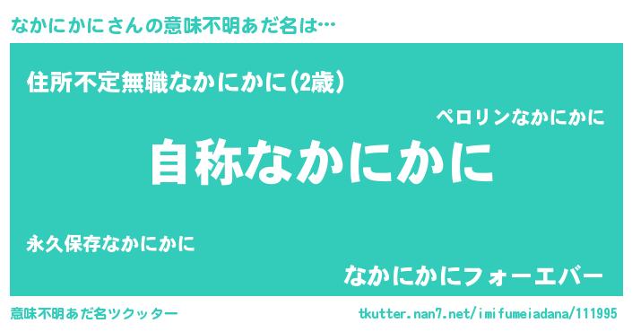 | 男性向けラノベタイトル風あだ名 | 『なかにかにに滅ぼされるだけの簡単なお仕事です』 |