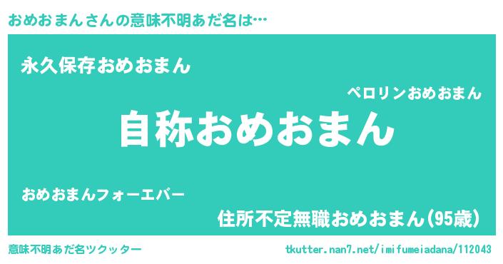 | 男性向けラノベタイトル風あだ名 | 『Re:おめおまんから始める異世界生活』 |
