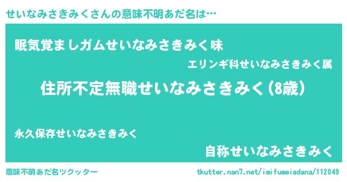 | 男性向けラノベタイトル風あだ名 | 『この素晴らしい世界にせいなみさきみくを!』 |