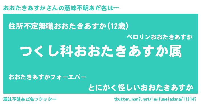| 男性向けラノベタイトル風あだ名 | 『おおたきあすか~年齢イコール彼女いない歴の魔法使い~』 |