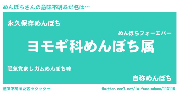 | 男性向けラノベタイトル風あだ名 | 『めんぼちに滅ぼされるだけの簡単なお仕事です』 |