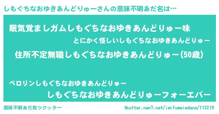 | 女子向けラノベタイトル風あだ名 | 『乙女ゲームの破滅フラグしかない悪役しもぐちなおゆきあんどりゅーに転生してしまった…』 |