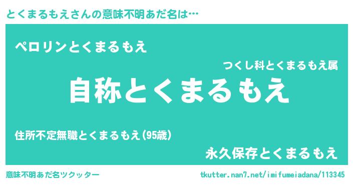 | 男性向けラノベタイトル風あだ名 | 『Re:とくまるもえから始める異世界生活』 |