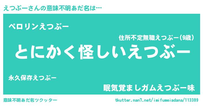 | 男性向けラノベタイトル風あだ名 | 『ダンジョンにえつぶーを求めるのは間違っているだろうか』 |