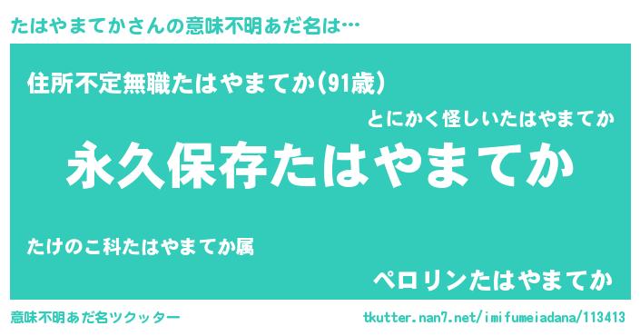 | 男性向けラノベタイトル風あだ名 | 『たはやまてかという概念が存在しない退屈な世界 』 |