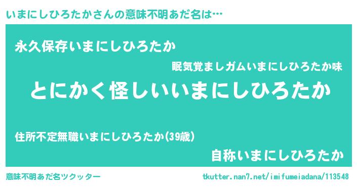 | ヘコむあだ名 | 『いまぷりん』『いまにしひろたか(遠い目)』 |