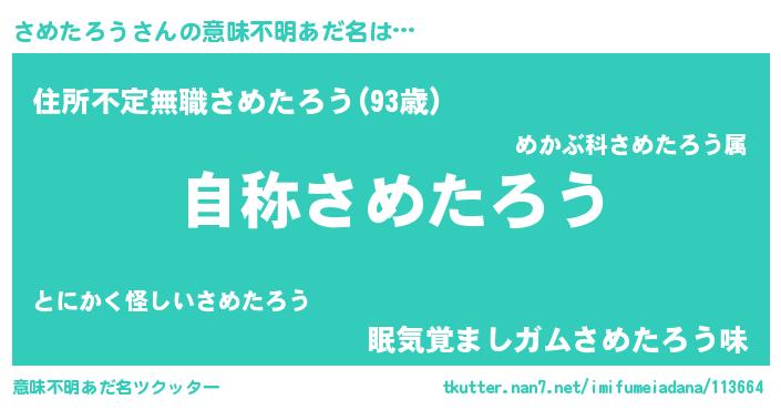 | 男性向けラノベタイトル風あだ名 | 『Re:さめたろうから始める異世界生活』 |