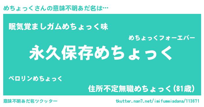 | 男性向けラノベタイトル風あだ名 | 『めちょっくという概念が存在しない退屈な世界 』 |
