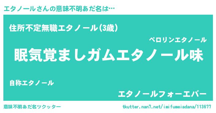 | 男性向けラノベタイトル風あだ名 | 『おまえをオタクにしてやるから、俺をエタノールにしてくれ! 』 |