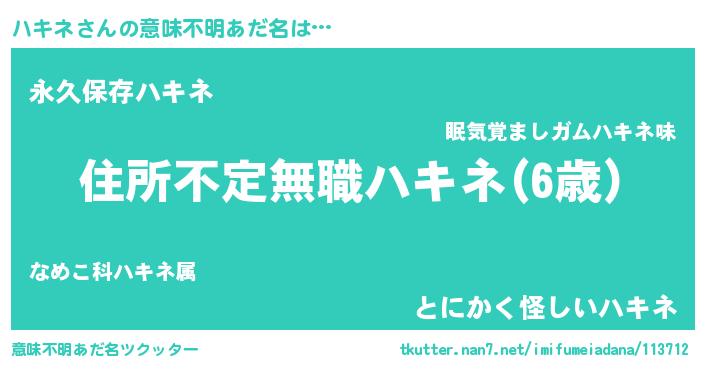 | 男性向けラノベタイトル風あだ名 | 『この素晴らしい世界にハキネを!』 |