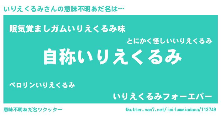 | 男性向けラノベタイトル風あだ名 | 『Re:いりえくるみから始める異世界生活』 |