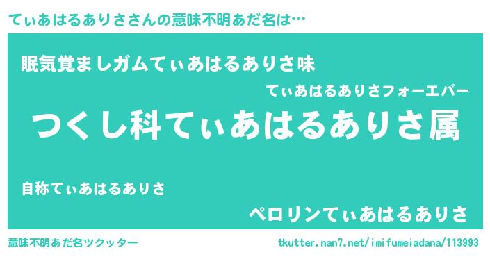 | 男性向けラノベタイトル風あだ名 | 『てぃあはるありさ~年齢イコール彼女いない歴の魔法使い~』 |