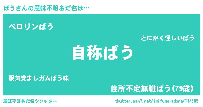 | 男性向けラノベタイトル風あだ名 | 『Re:ばうから始める異世界生活』 |