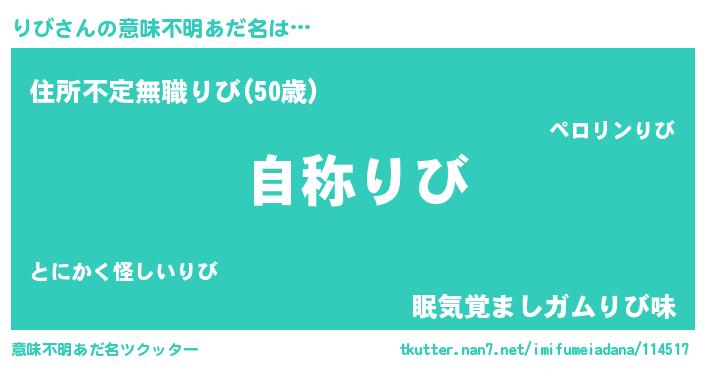 | 男性向けラノベタイトル風あだ名 | 『Re:りびから始める異世界生活』 |