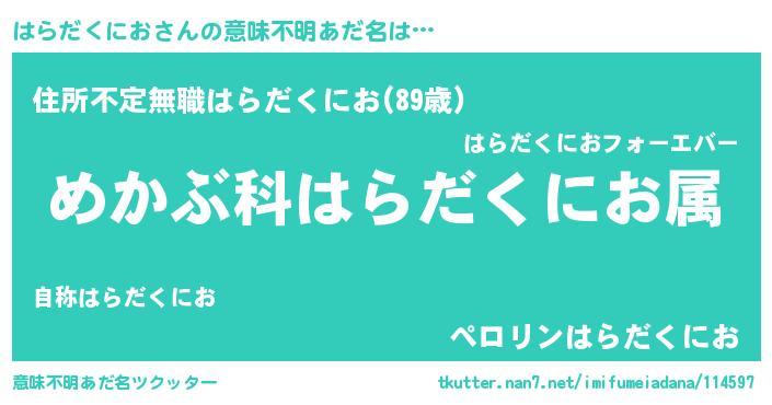 | 欧米人風あだ名 | 『アンジェラ・はらだくにお』 |