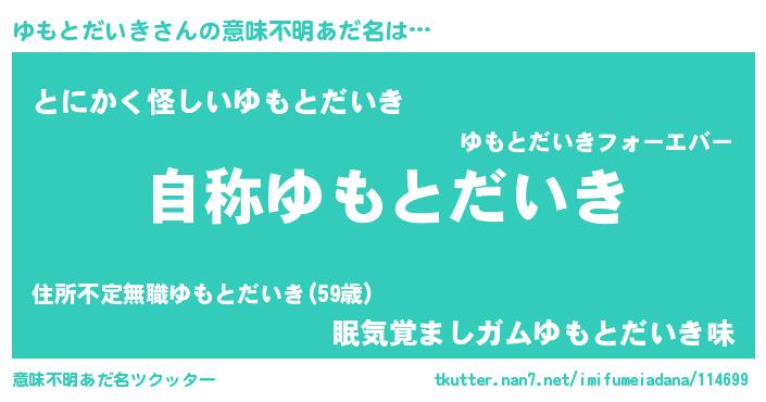 | 男性向けラノベタイトル風あだ名 | 『Re:ゆもとだいきから始める異世界生活』 |