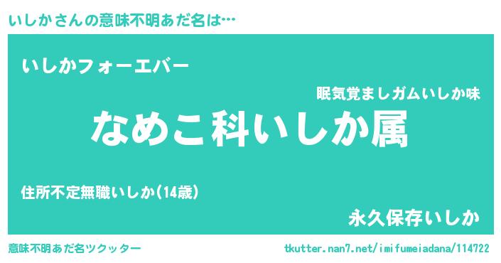 | 男性向けラノベタイトル風あだ名 | 『いしかに滅ぼされるだけの簡単なお仕事です』 |