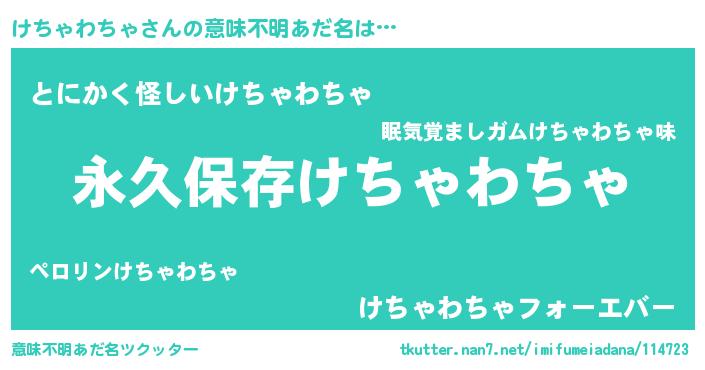 | 男性向けラノベタイトル風あだ名 | 『けちゃわちゃという概念が存在しない退屈な世界 』 |