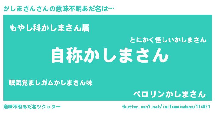 | 男性向けラノベタイトル風あだ名 | 『Re:かしまさんから始める異世界生活』 |