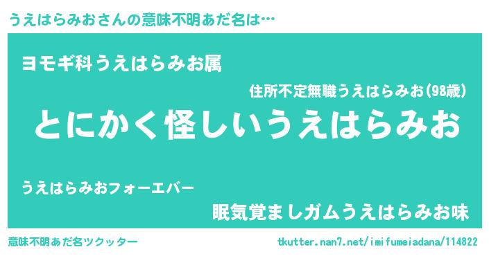 | 男性向けラノベタイトル風あだ名 | 『うえはらみおの嫁は女の子じゃないと思った?』 |