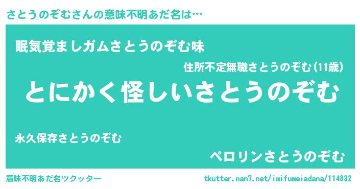 | 男性向けラノベタイトル風あだ名 | 『さとうのぞむの嫁は女の子じゃないと思った?』 |