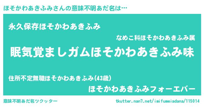| ヘコむあだ名 | 『ほそかわあきふみ(笑)』『酢こんぶ』 |