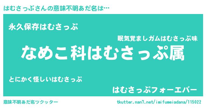 | 男性向けラノベタイトル風あだ名 | 『転生したらはむさっぷだった件』 |