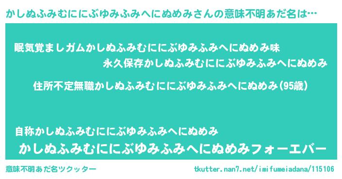 | 欧米人風あだ名 | 『アンジェラ・かしぬふみむににぶゆみふみへにぬめみ』 |