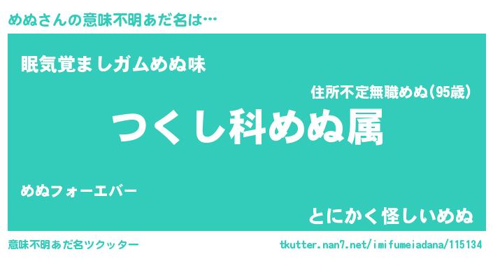 | 女子向けラノベタイトル風あだ名 | 『めぬの玉の輿計画!』『死神めぬの再婚』 |