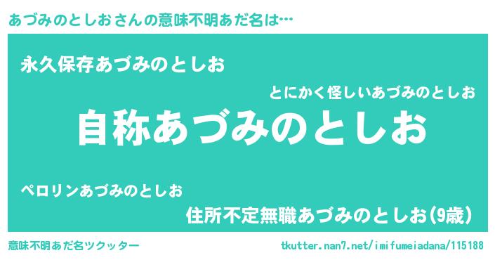 | 男性向けラノベタイトル風あだ名 | 『Re:あづみのとしおから始める異世界生活』 |