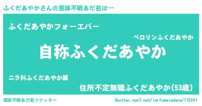 | 男性向けラノベタイトル風あだ名 | 『Re:ふくだあやかから始める異世界生活』 |