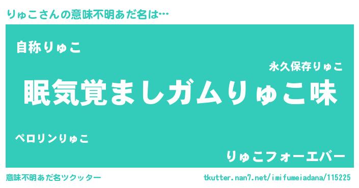 | 女子向けラノベタイトル風あだ名 | 『死神りゅこの再婚』『闇のりゅこ』 |