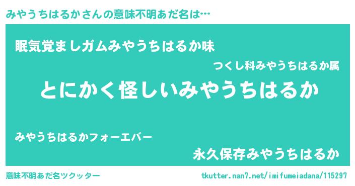 | 男性向けラノベタイトル風あだ名 | 『みやうちはるかの嫁は女の子じゃないと思った?』 |