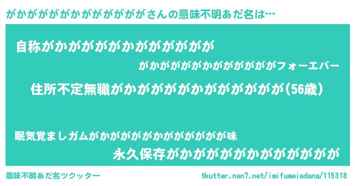 | 女子向けラノベタイトル風あだ名 | 『乙女ゲームの破滅フラグしかない悪役がかががががかががががががに転生してしまった…』 |