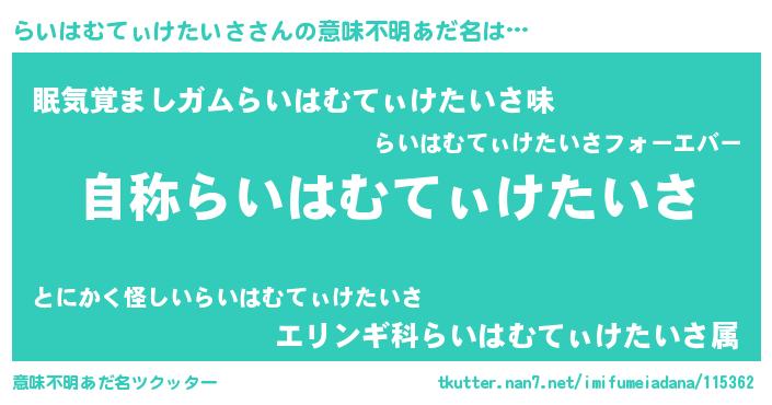 | 男性向けラノベタイトル風あだ名 | 『Re:らいはむてぃけたいさから始める異世界生活』 |