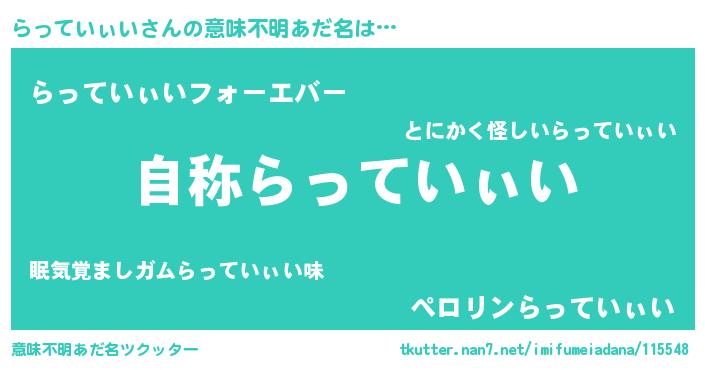| 男性向けラノベタイトル風あだ名 | 『Re:らっていぃいから始める異世界生活』 |
