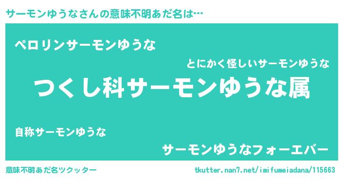| 男性向けラノベタイトル風あだ名 | 『サーモンゆうな~年齢イコール彼女いない歴の魔法使い~』 |