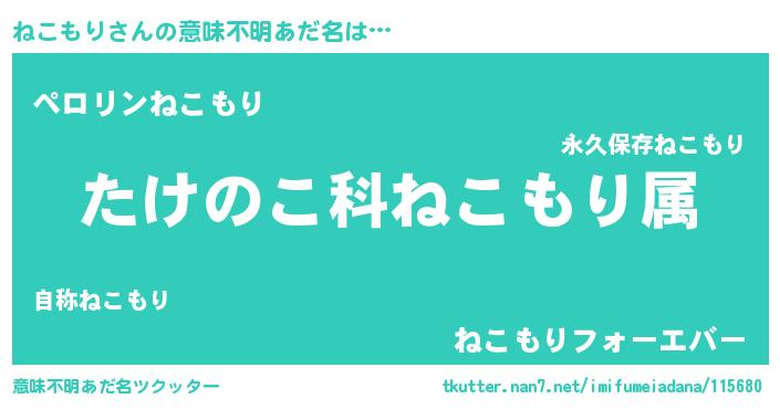 | 男性向けラノベタイトル風あだ名 | 『転生したらねこもりだった件』 |
