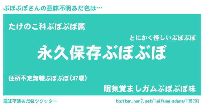 | 男性向けラノベタイトル風あだ名 | 『ぶぼぶぼという概念が存在しない退屈な世界 』 |