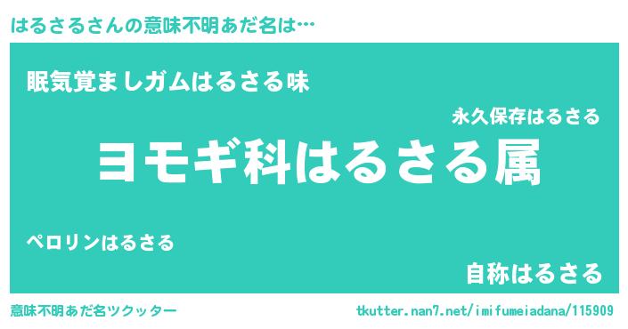 | 男性向けラノベタイトル風あだ名 | 『はるさる~年齢イコール彼女いない歴の魔法使い~』 |
