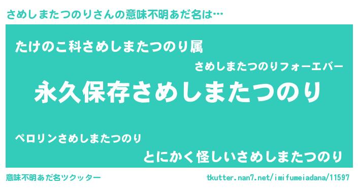| 男性向けラノベタイトル風あだ名 | 『さめしまたつのりに滅ぼされるだけの簡単なお仕事です』 |