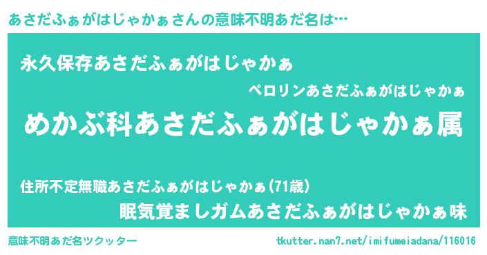 | 胡散臭い通販商品みたいなあだ名 | 『絶対に幸福をもたらす水素水…その名も「あさだふぁがはじゃかぁ」』 |