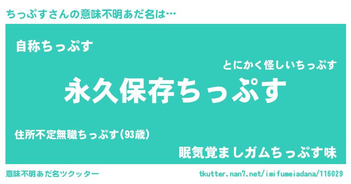 | 男性向けラノベタイトル風あだ名 | 『ちっぷすという概念が存在しない退屈な世界 』 |